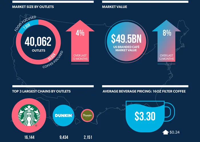 - US branded coffee shop market achieves strong net outlet growth, increasing 4% to reach 40,062 stores