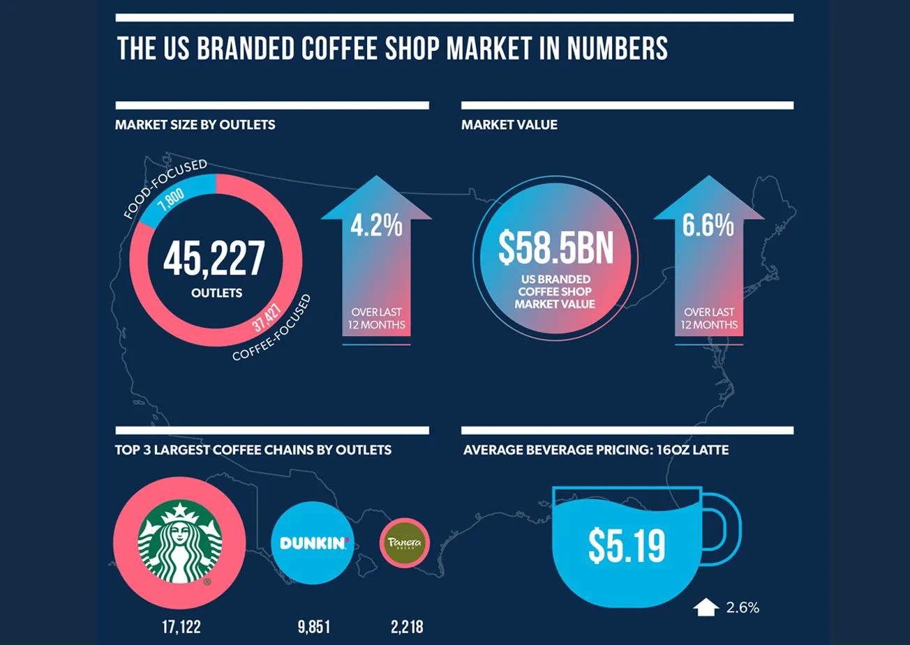 - Total US branded coffee shop market sales forecast to exceed $63bn over the next 12 months and $82bn by 2030