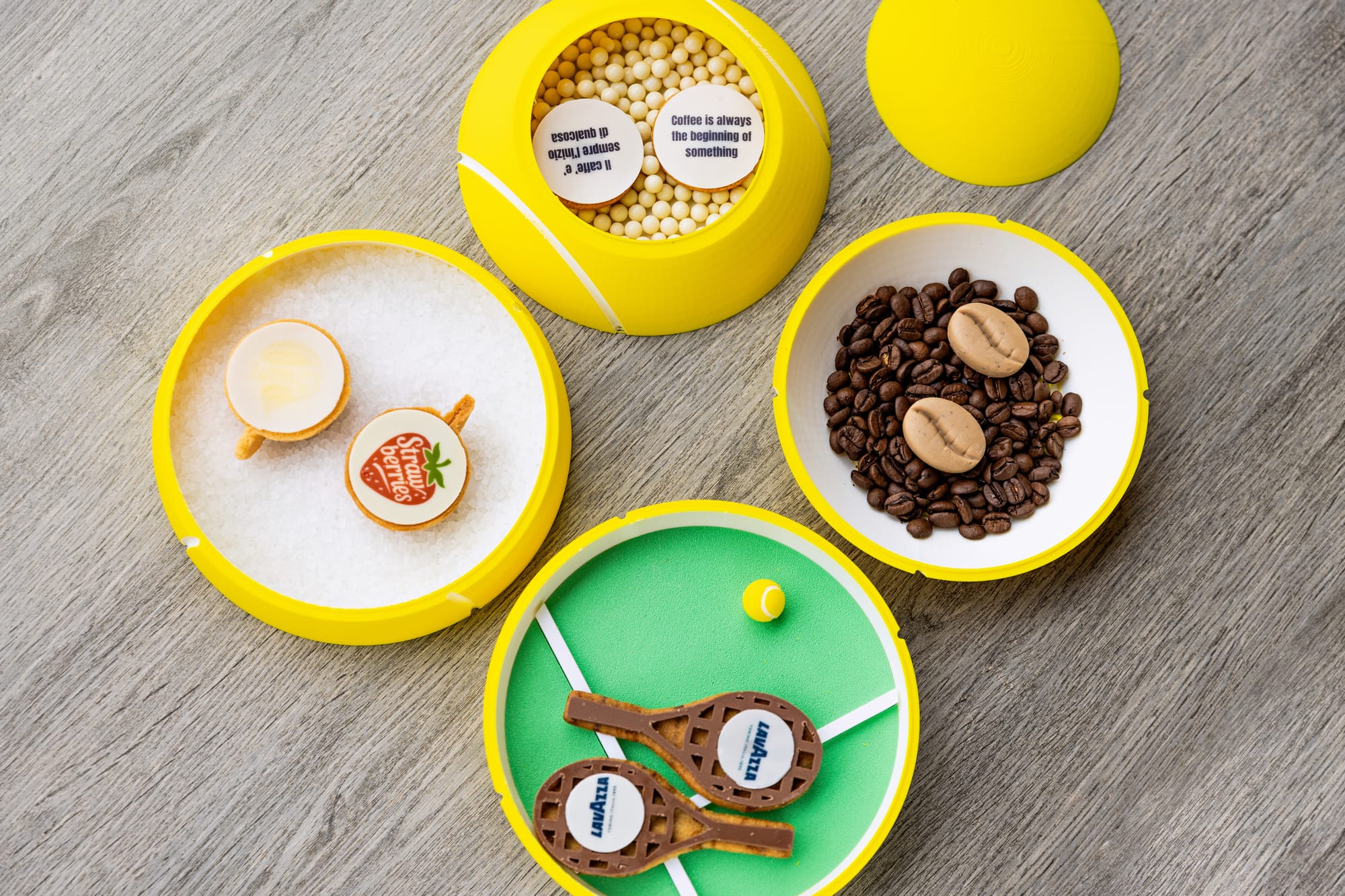 With this Championships-themed coffee pairing, guests are invited to explore Fiorani’s exquisite creations layered within a 3D-printed tennis ball made entirely from reusable and sustainable corn starch.